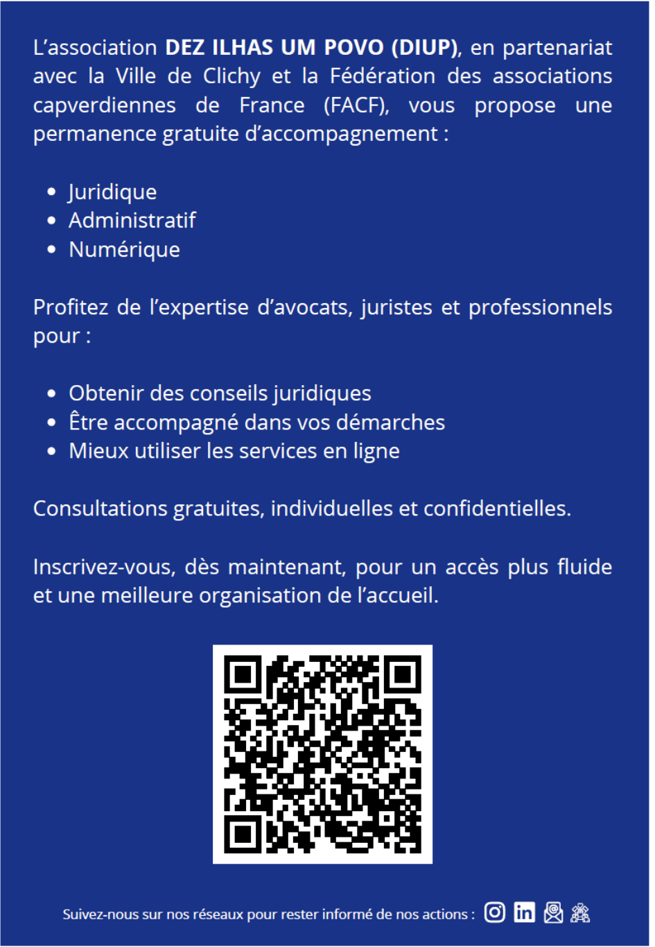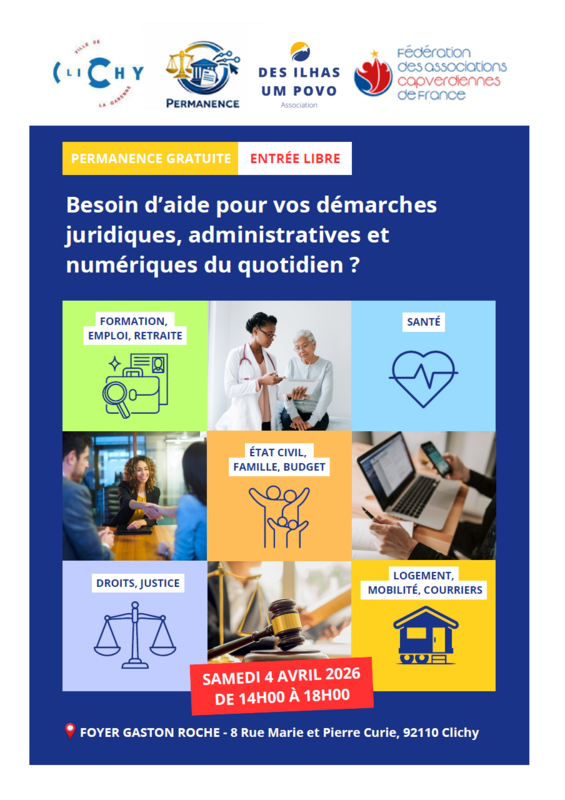 Le samedi 4 avril de 14h à 18h, l'association DEZ ILHAS UM POVO organise une permanence Juridique, Administrative et numérique dans la salle polyvalente attenante au Foyer Gaston Roche